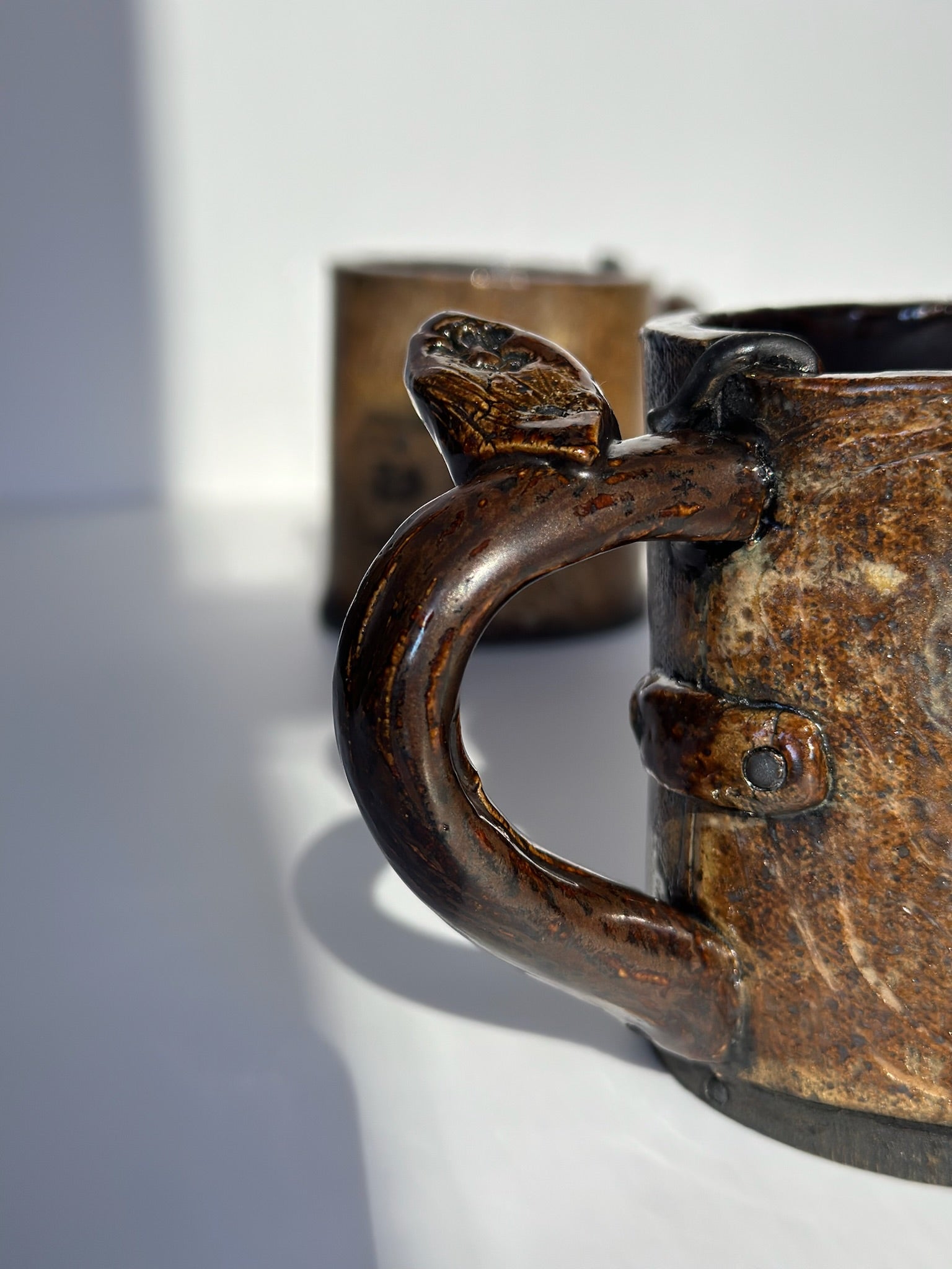 This mug is part of "re-claiMed" collection and is completely hand built. The glaze combination mimics denatured driftwood, moss and metal detailing.